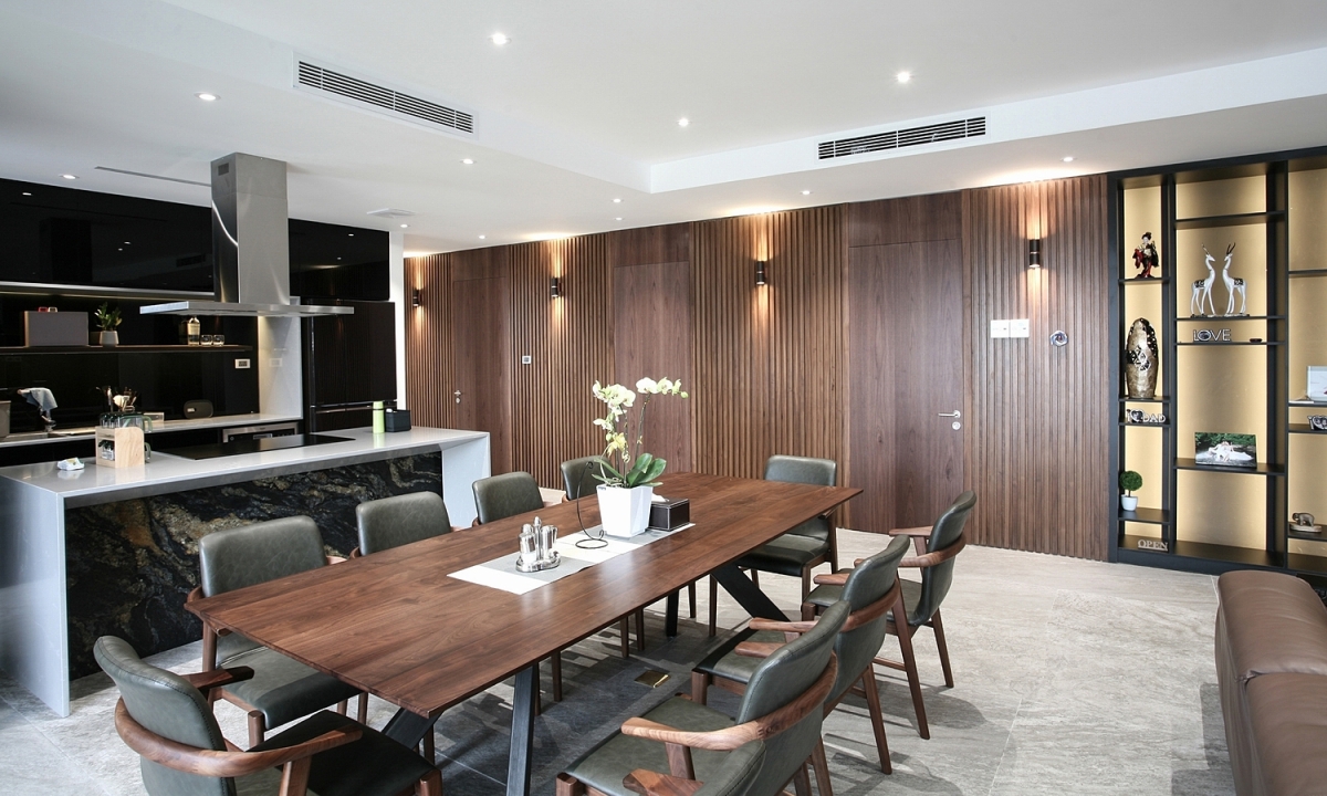 Mặt bằng công năng gần như được bố trí lại hoàn toàn. Không gian phòng khách và phòng ăn là trung tâm, liền với mặt thoáng kéo dài của căn hộ. Các phòng chức năng khác bám lấy không gian này, khu vệ sinh vẫn được đặt trên cơ sở vị trí cũ để đảm bảo thuận tiện cho hệ thống kỹ thuật.