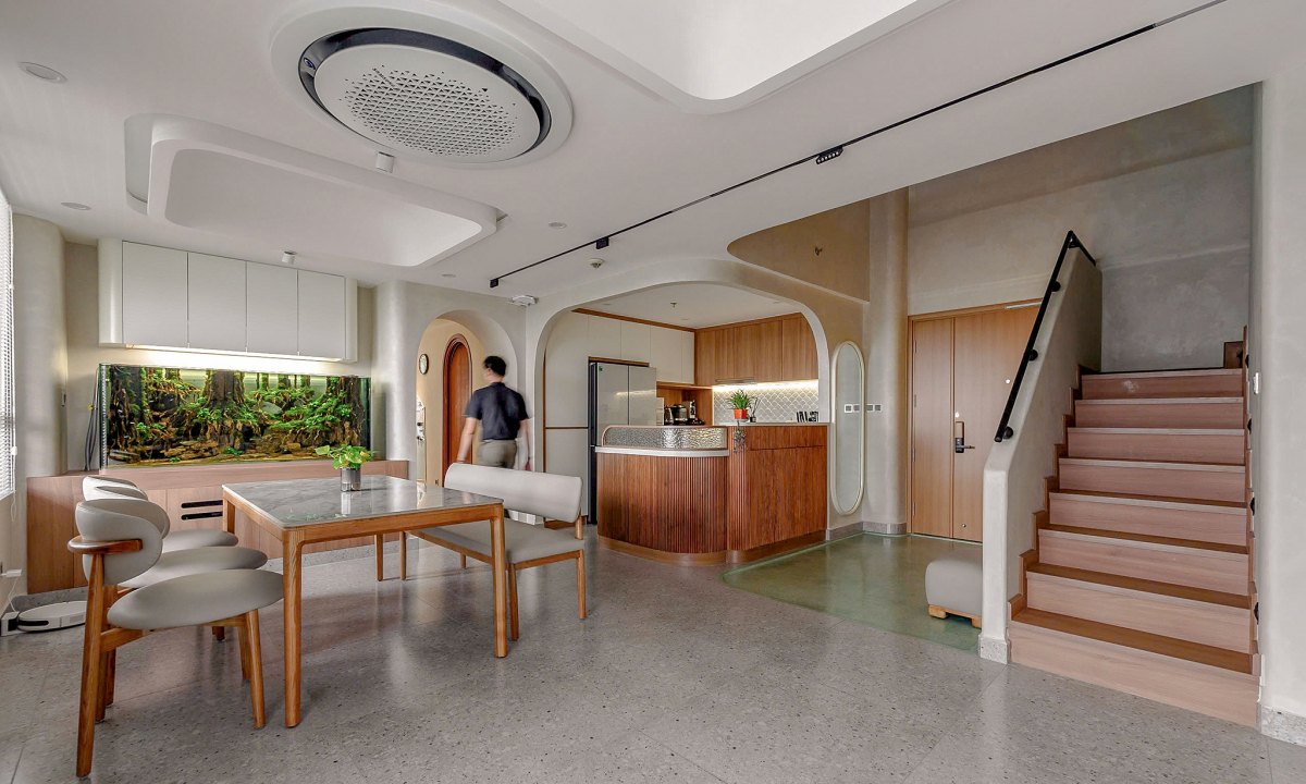 Phần lớn diện tích tầng một được thiết kế không gian sinh hoạt chung. Được cải tạo từ không gian nhỏ hẹp của căn hộ truyền thống, tầng một được thay đổi theo hướng mở và tối giản, sử dụng vật liệu tự nhiên như gỗ và bê tông hiệu ứng để mang đến sự ấm áp, gần gũi.