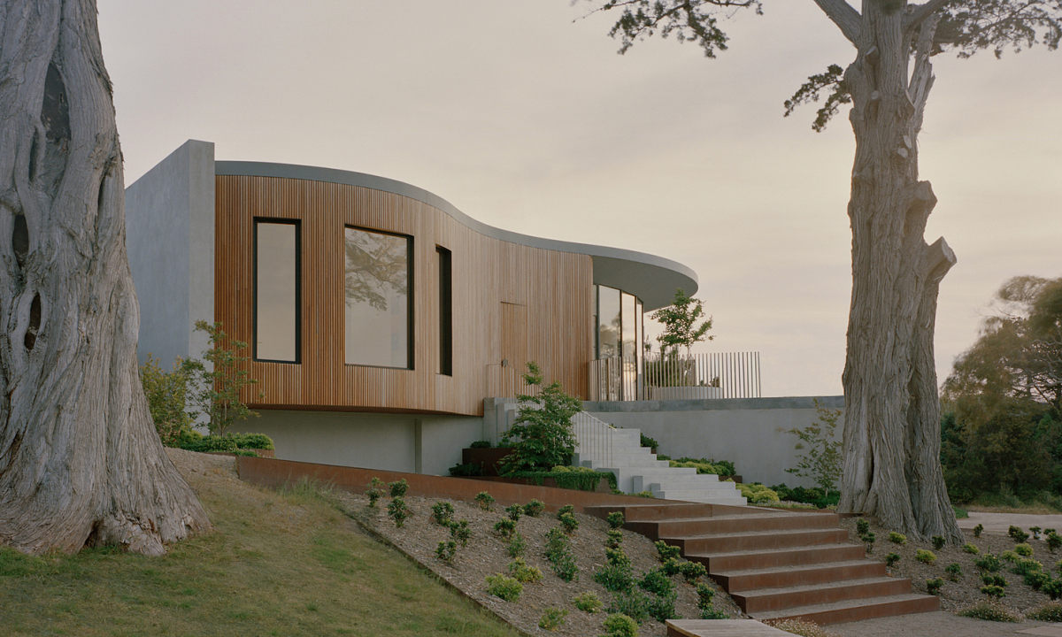 Ngôi nhà hướng hồ với mặt tiền gỗ lượn sóng